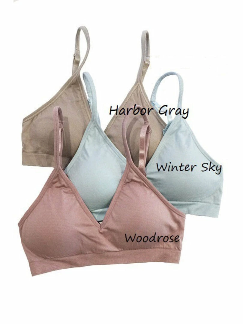 Our best-seller seamless bra with V-neck, adjustable straps, removable cups, bottom band, and perfect amount of stretch. (88% Nylon, 12% Spandex) 32A-32B-34A-34B-36B