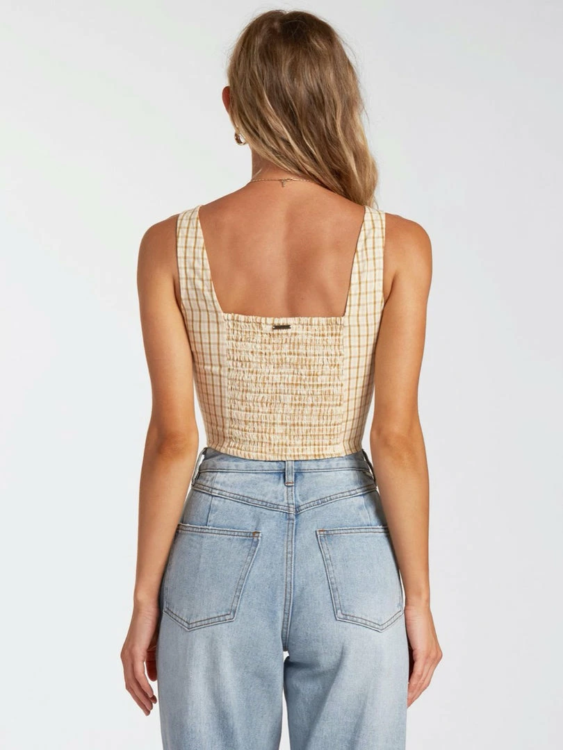 The Billabong Check It Women’s Top cuts a natural fabric with modern lines. Contrasting a structured design with a relaxed cotton and flax blend fabric, the women’s crop top is finished with an allover check print. Wide straps create a square neckline, while a smocked back creates a fitted silhouette.