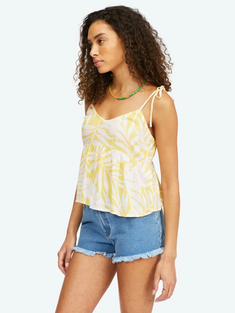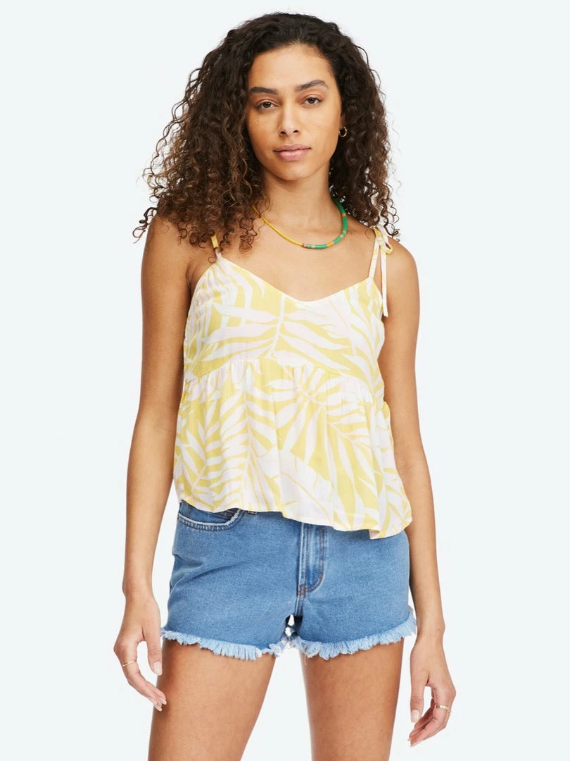 The Hey There cropped cami top is here and happy to meet you. Saturated in sunny hues and paradise palms, this women’s cami top from our Sweet Tropics Collection features a bold tropical print on crinkle fabric. The peplum waist ruffle keeps it lightweight and flowy, while the V-neckline and sweets shoulder ties add to its laid-back vibe.