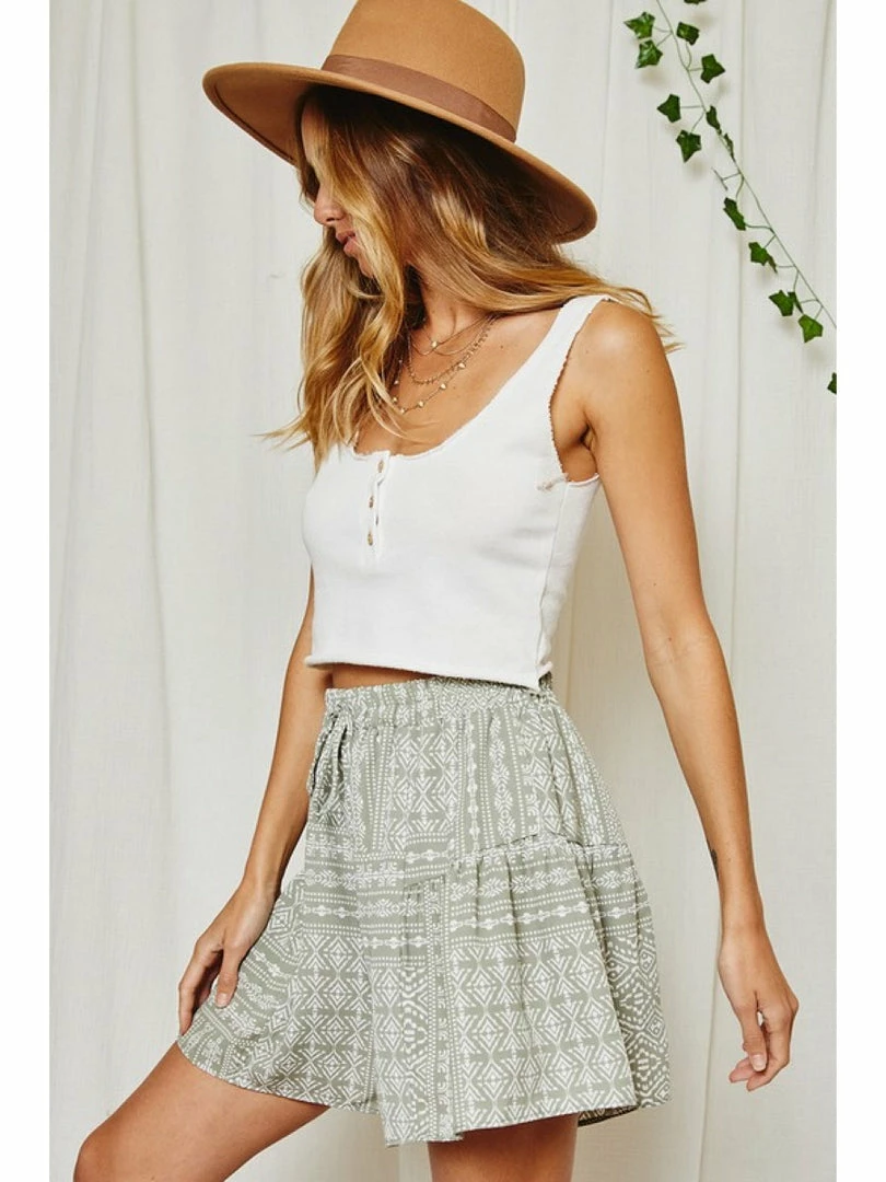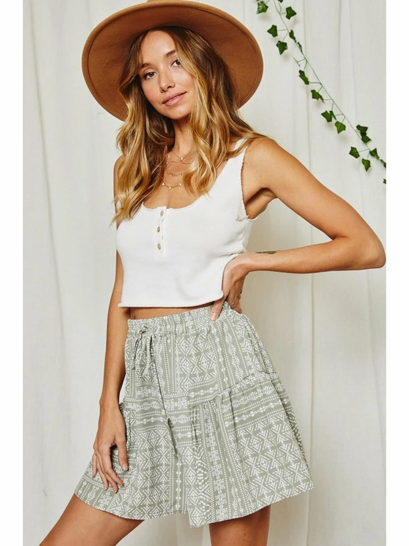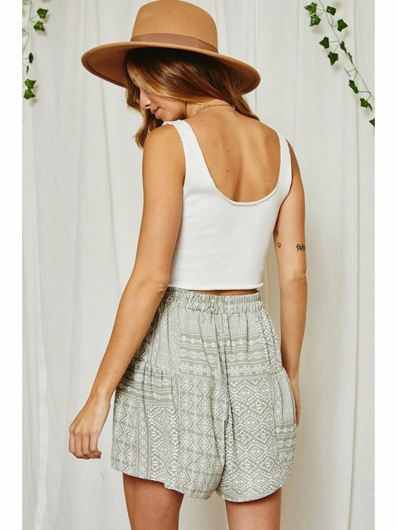 Non stretch fabric, geometric tribal print, great for resort wear, elastic at waist and self tie. Wide leg easy to wear casual shorts