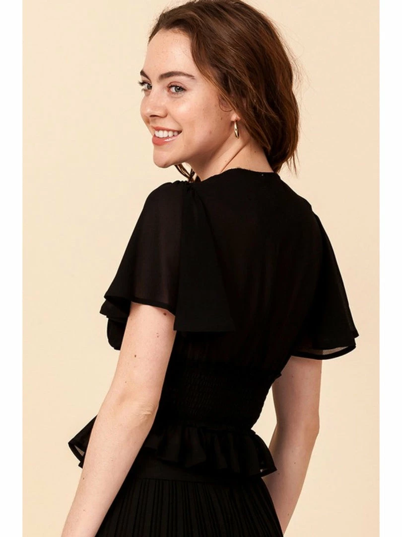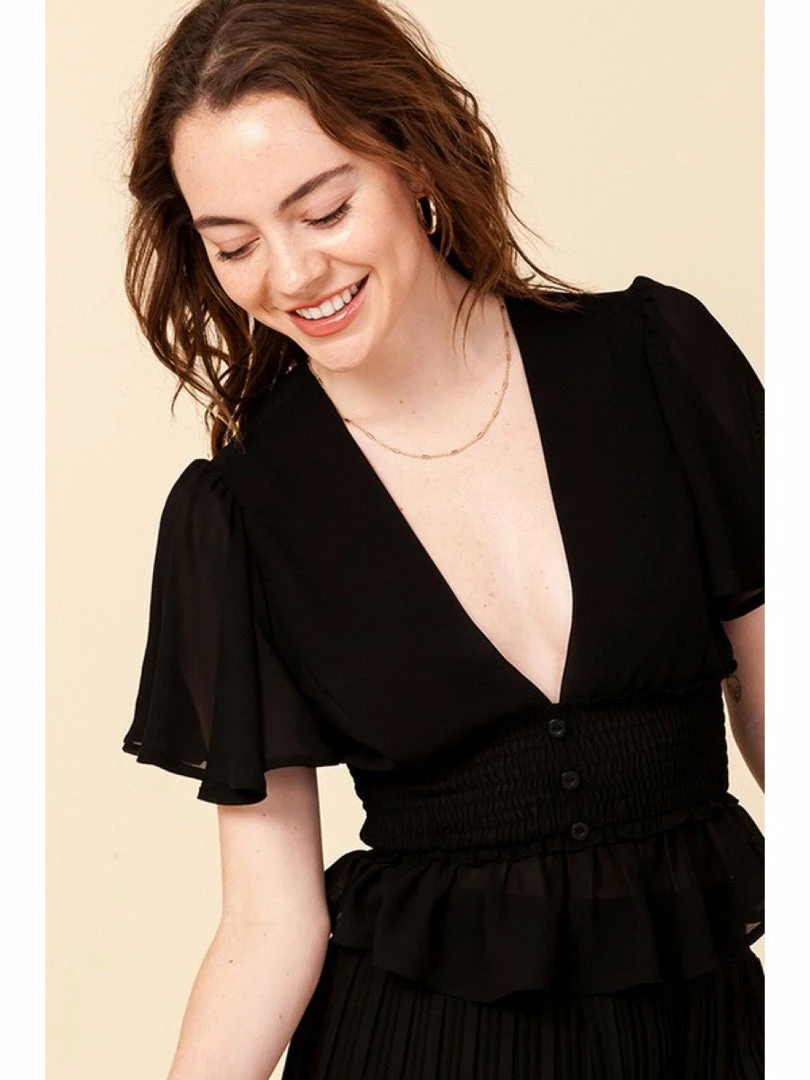 DEEP V NECK PEPLUM BLOUSE WITH RUCHE WAIST DETAIL -100% POLYESTER - IMPORTED. DESIGNED BY USA - MODEL IS 5' 7.5" TALL, 32B CHEST, 24" WAIST AND 35" HIPS AND WEARING A SIZE SMALL