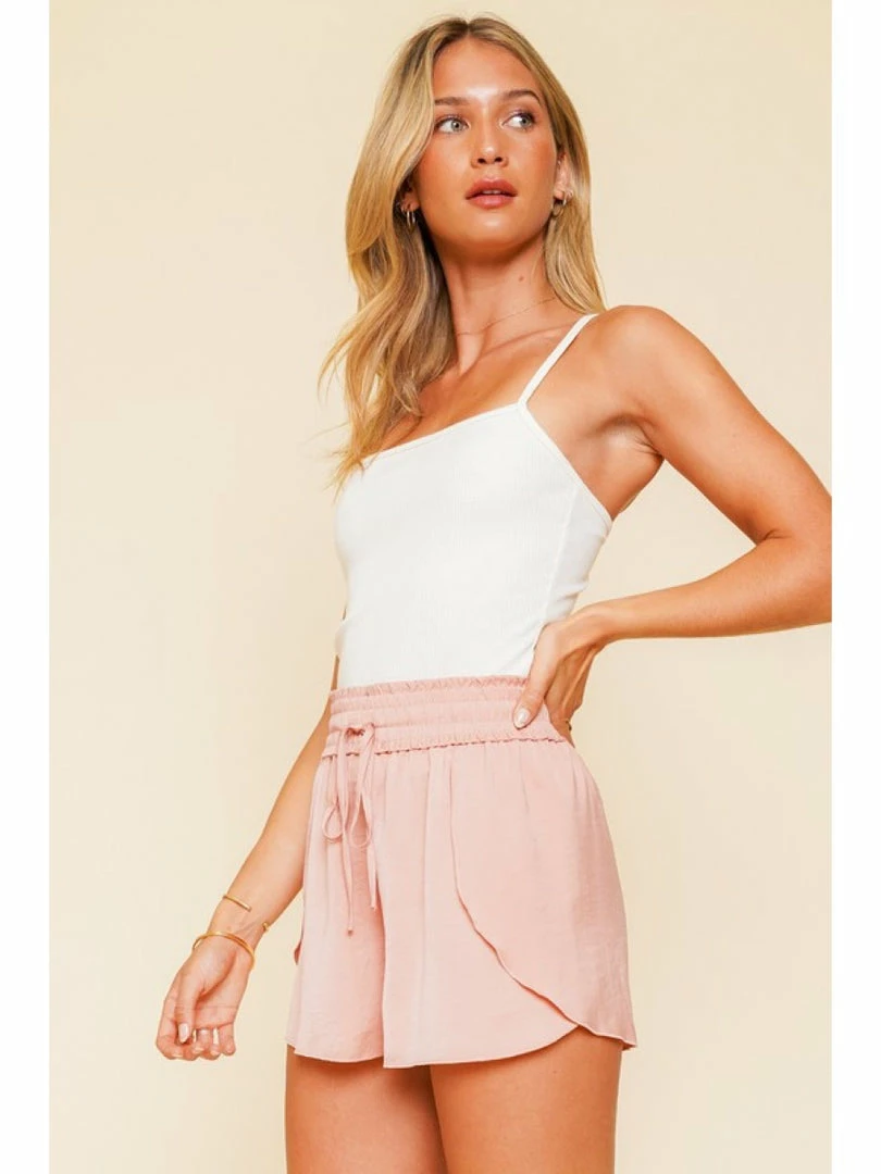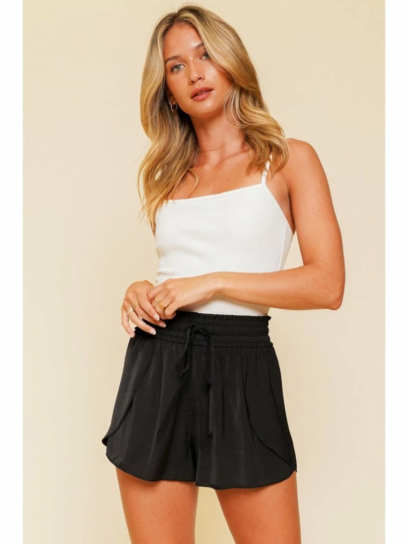 CURTAIN HEM WASHER SATIN SHORTS 100% POLYESTER MODEL HEIGHT 5'8" WEARING A SMALL SIZE