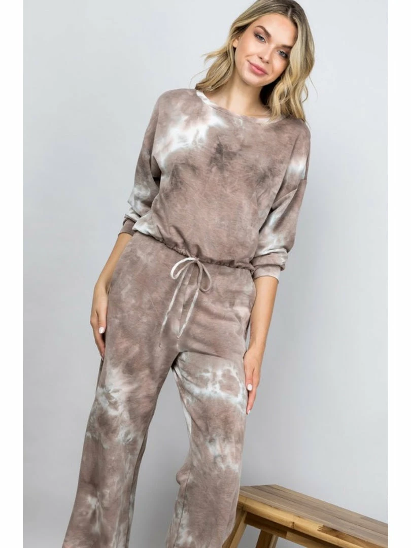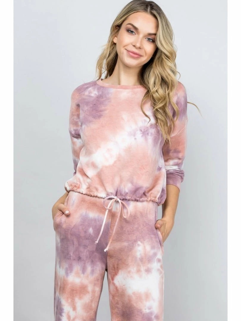 A SUPER SOFT TIE DYE, INSIDE BRUSHED FRENCH TERRY FABRIC FEATURING A LONG SLEEVE TOP WITH ADJUSTABLE HEM AND LONG PANTS AS A PERFECT DUO.