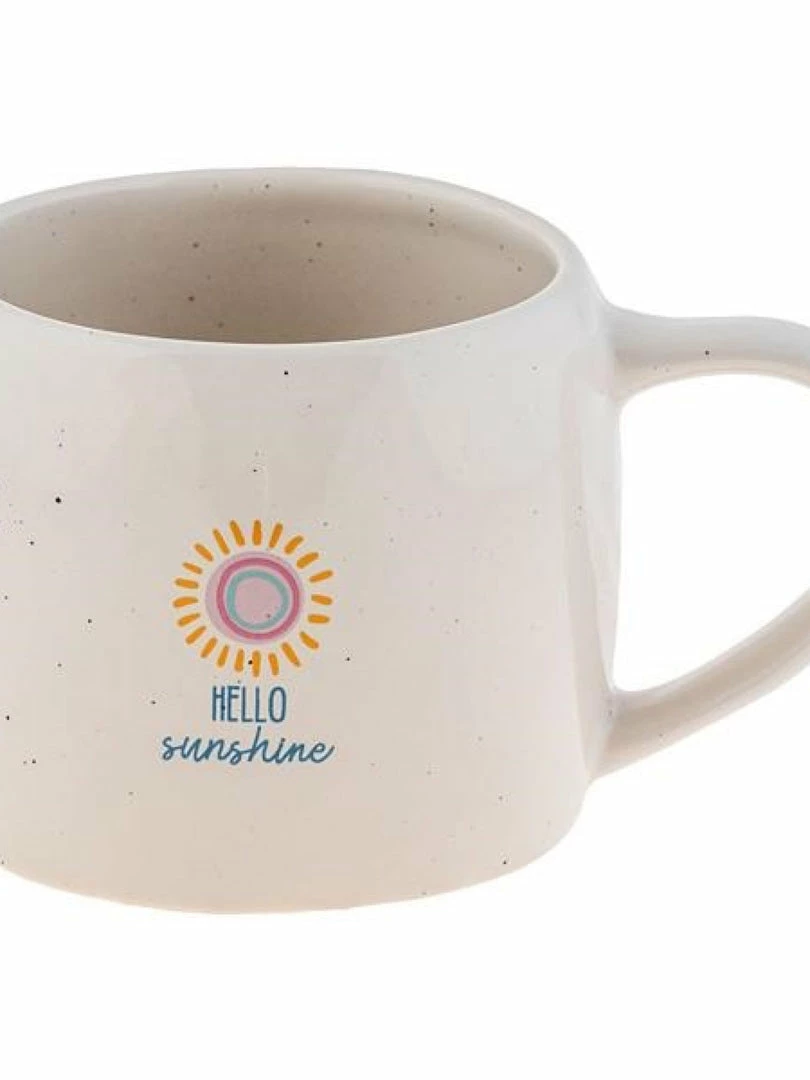 The Karma Hello Sunshine Tapered Reese Mug features a little sun illustration with “Hello Sunshine” underneath it, along with tiny paint speckles inside and out.