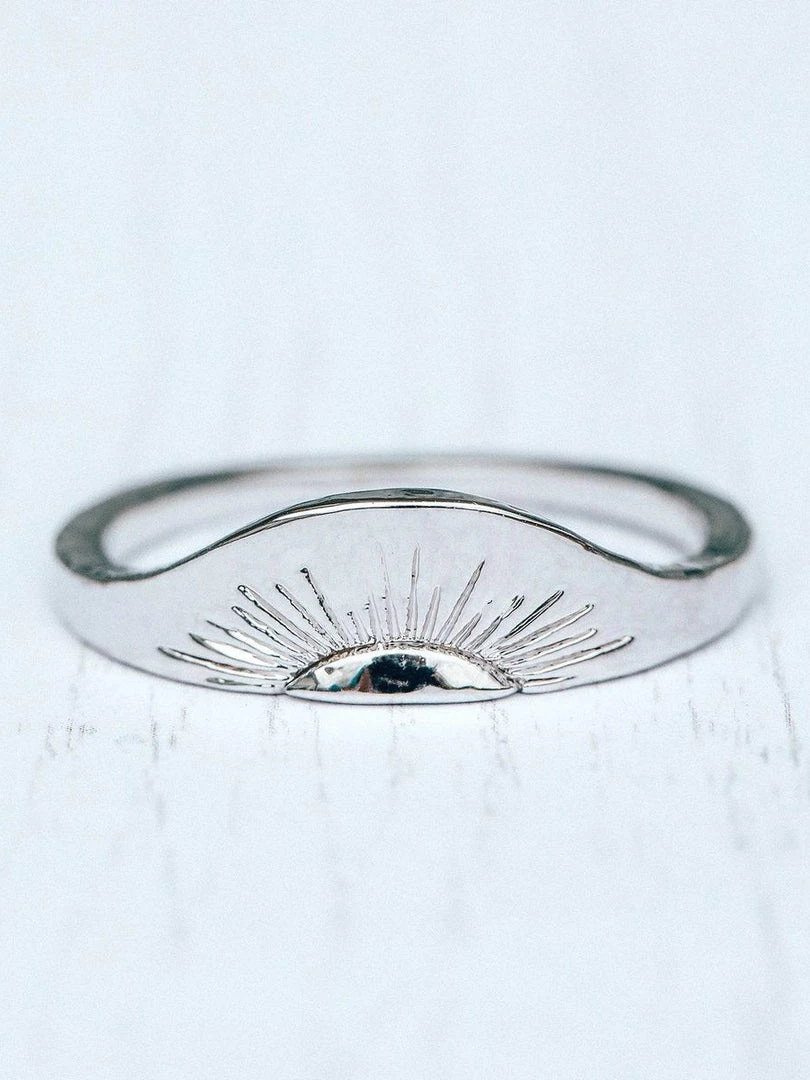 No need to wake up in time to see the sun rise when you can wear our Rising Sun Ring instead. This etched, signet-style ring comes in two metal finishes—silver and gold—and is designed to easily stack with other styles for a layered look.