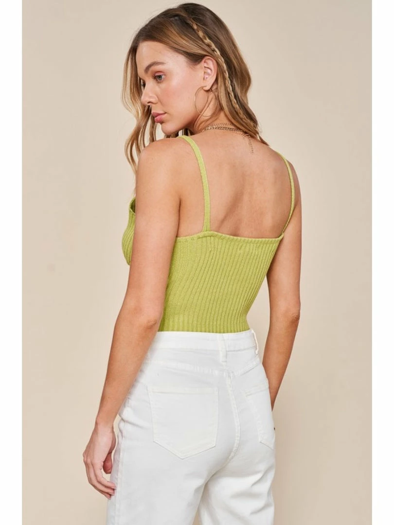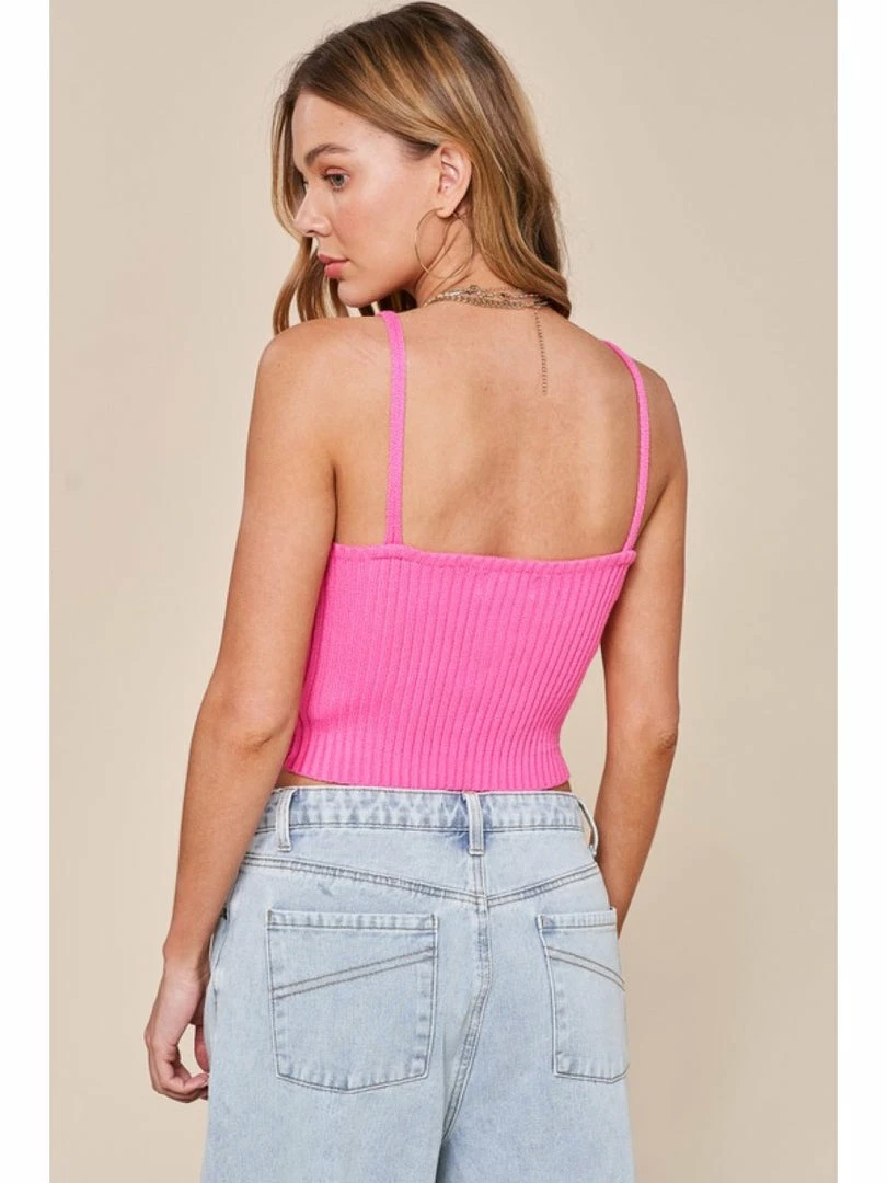 Sleeveless sweater weaved cropped top - Twisted detailing on center front - Low V neckline - Finished with clean weaved on hem - Model is 5' 10" 33-24-35 and wearing a size Small