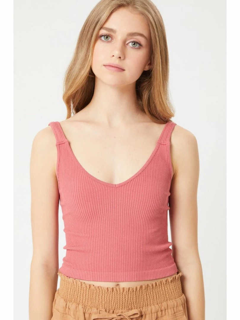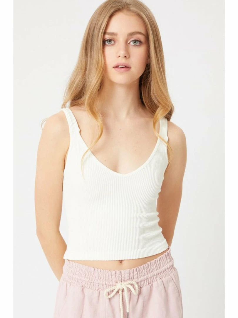 Ribbed sleeveless tank top featuring a V-neck line, and a slight crop at the length.