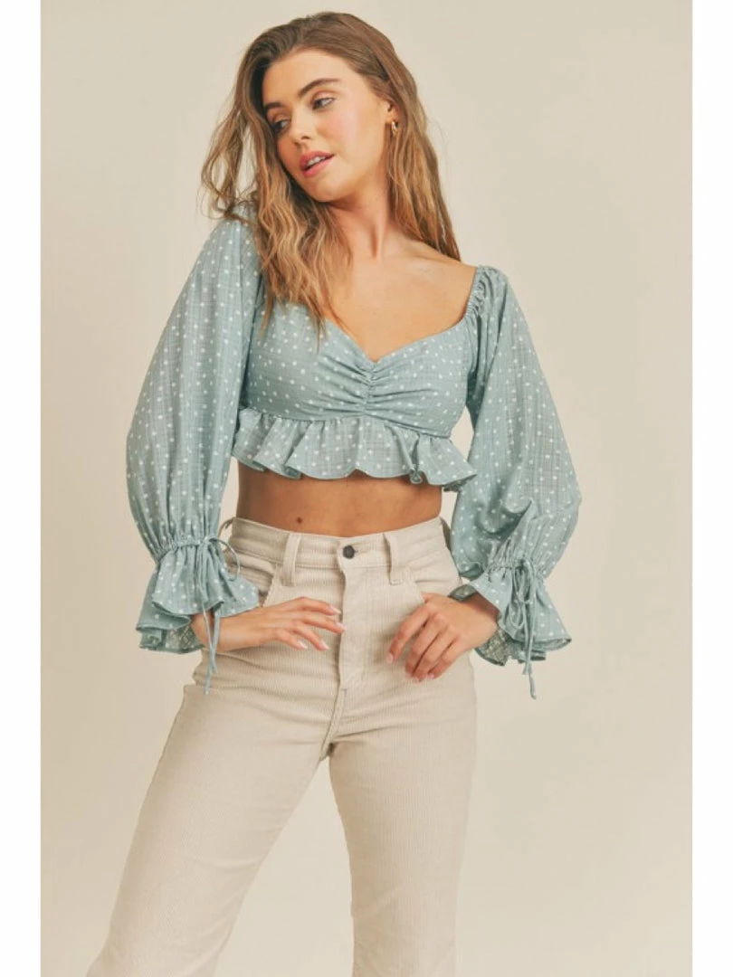 Polka Dot Sweetheart Cropped Blouse -Sweetheart neckline -Ruffle detail -Tie string cuffs -Smocked back