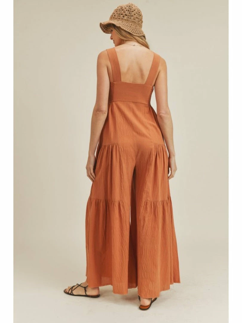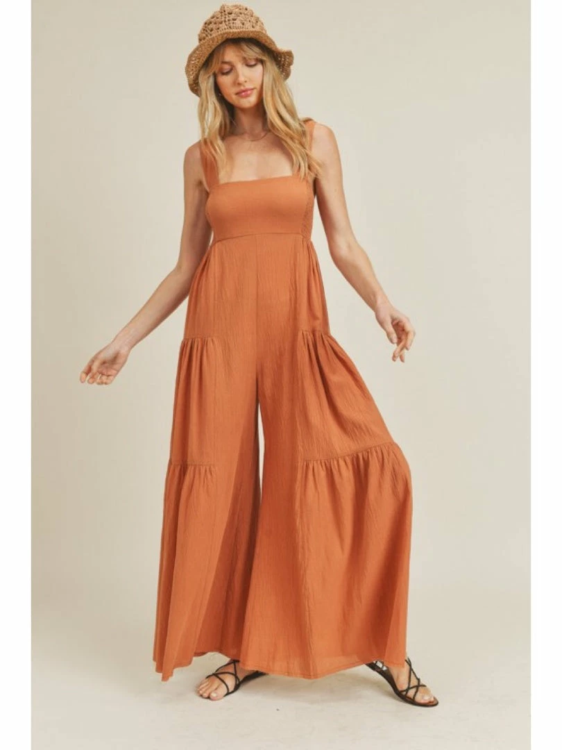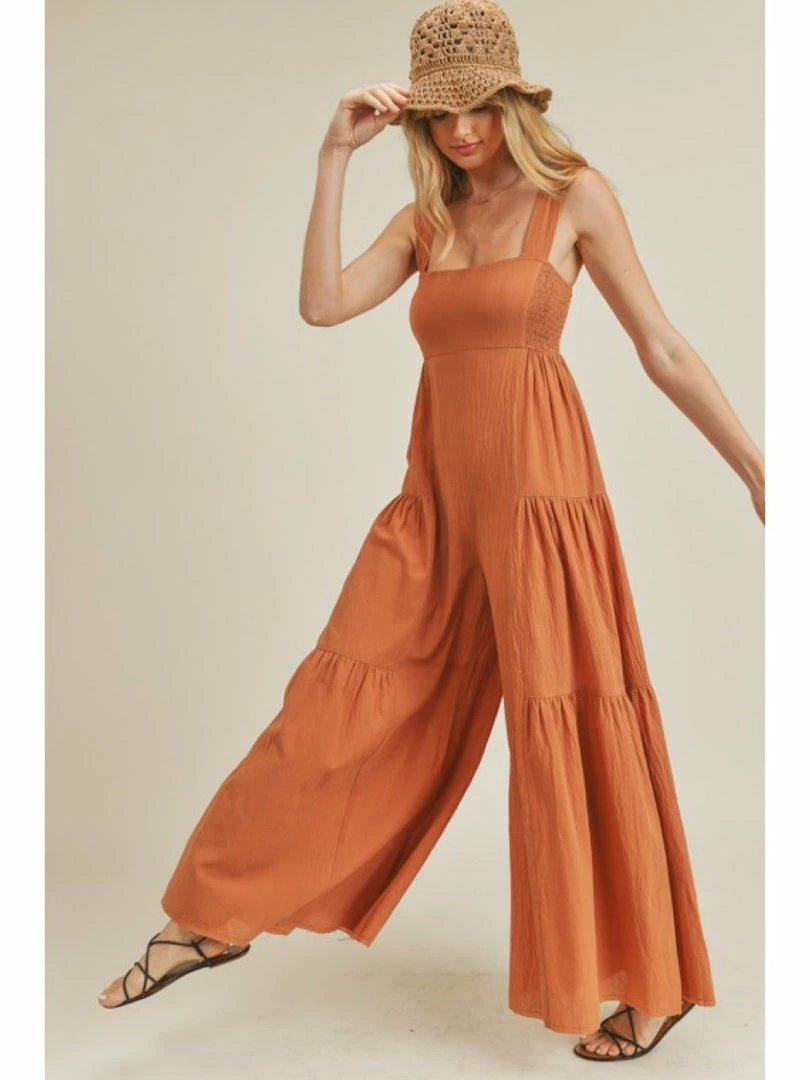 -Wide Leg Jumpsuit -Square neckline -Raw hem -Tiered detail -Smocked side detail