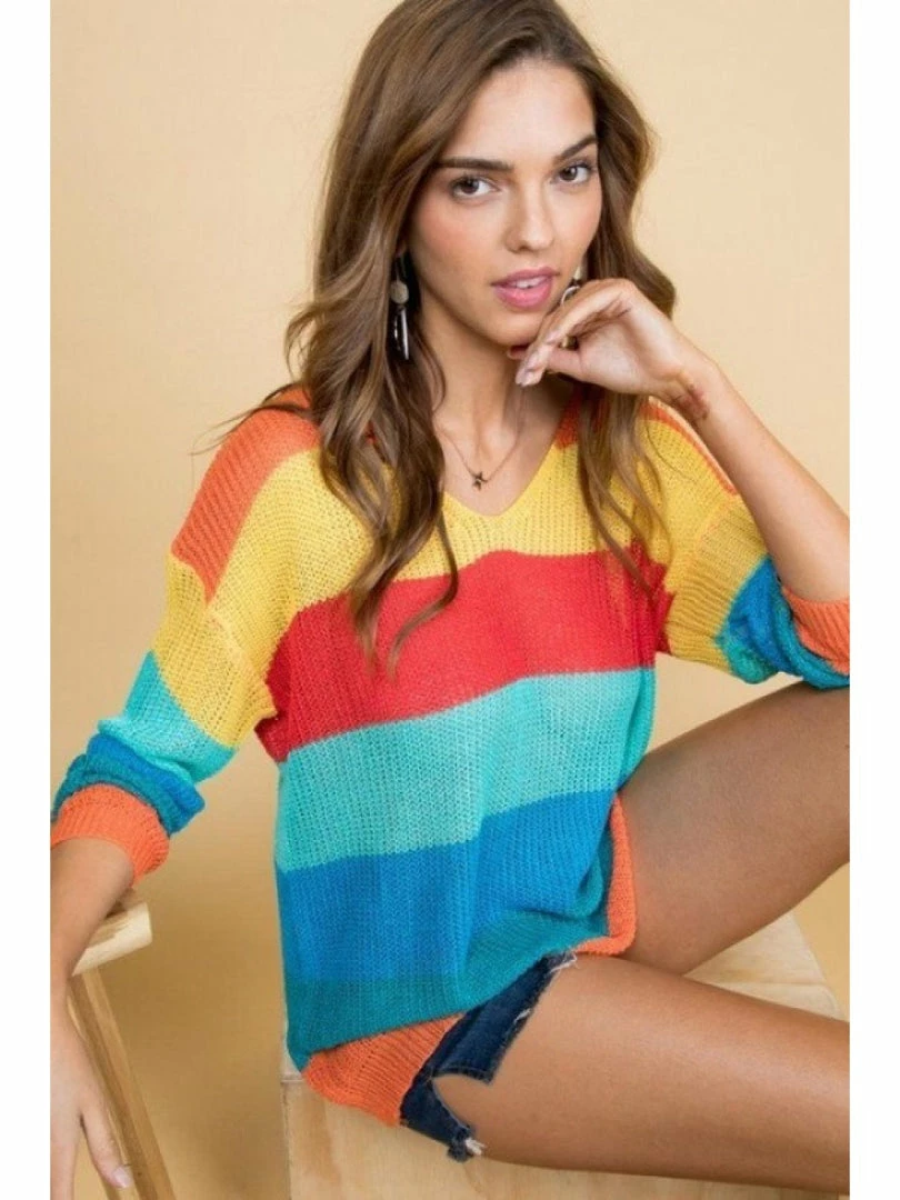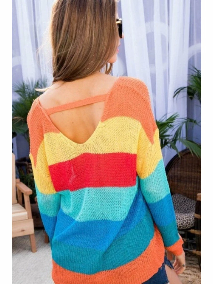 Scoop Neck Long Sleeve Back Chocker Multi Color Stripe Sweater