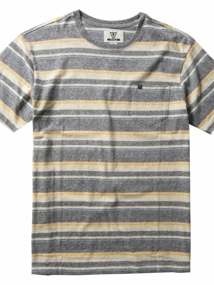 Faded Turtle stripe tee, a premium 30 singles yarn dyed snow heather crew neck with front pocket. Features side seam woven label and Vissla woven label. Garment soft washed for a smooth feel.