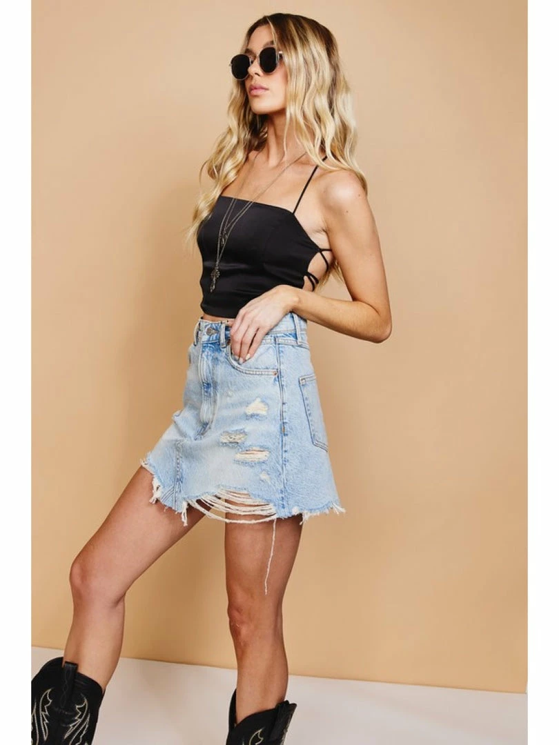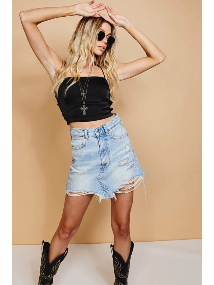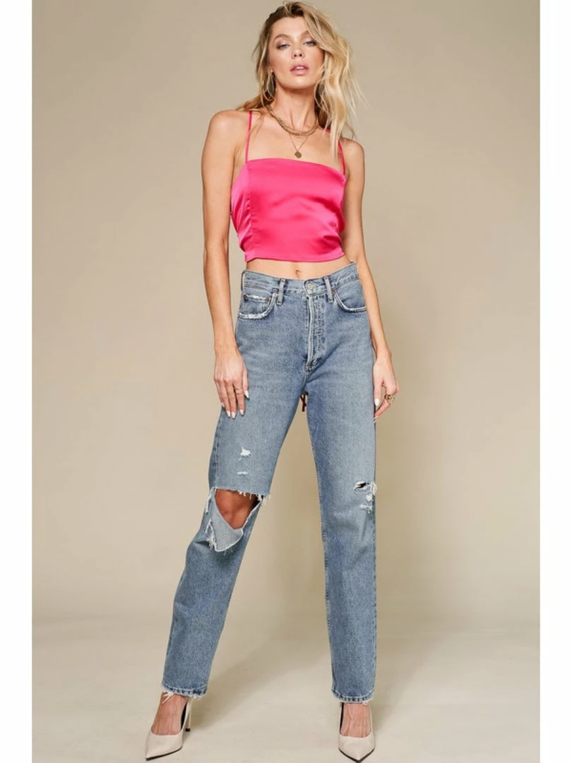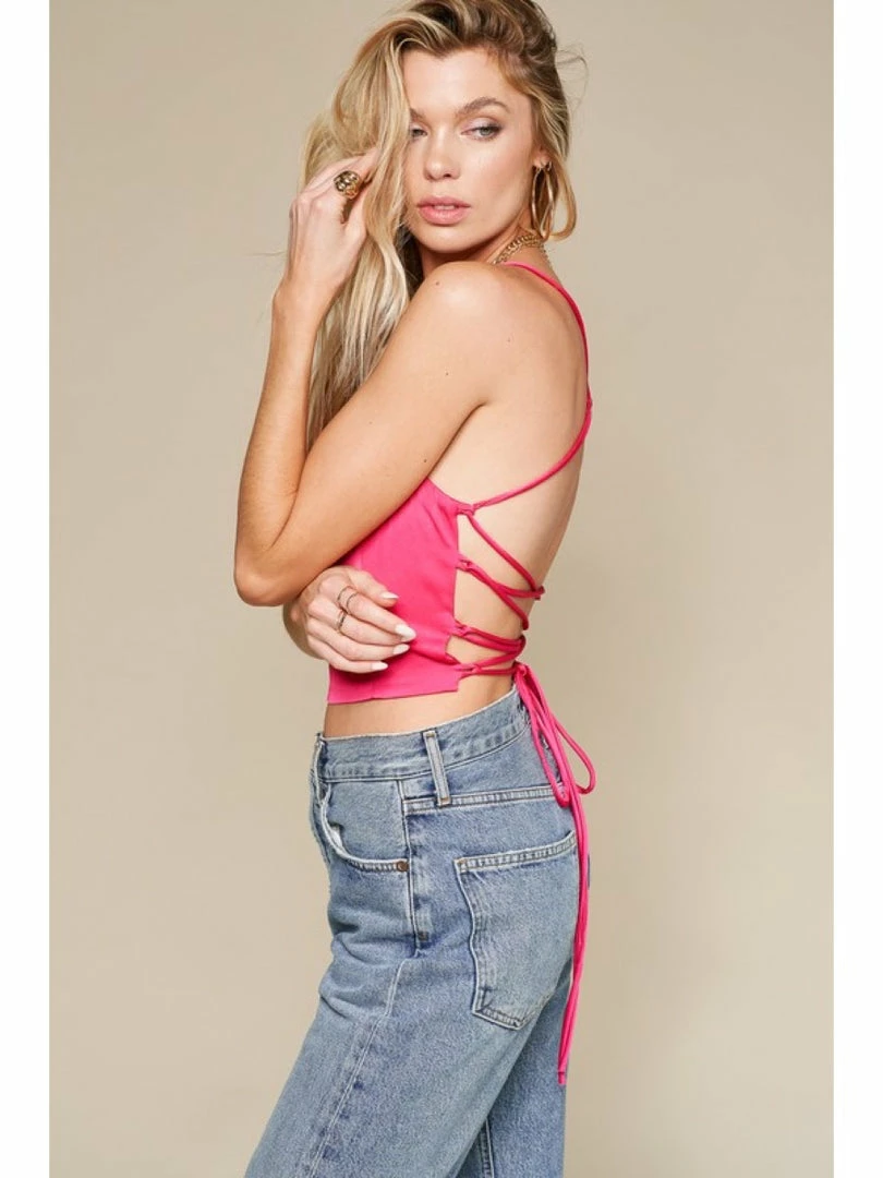 Satin look sleeveless dressy crop top with strappy back tie detail.