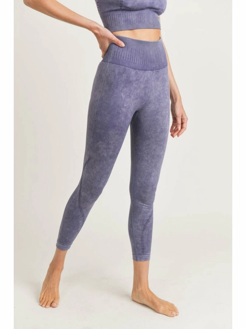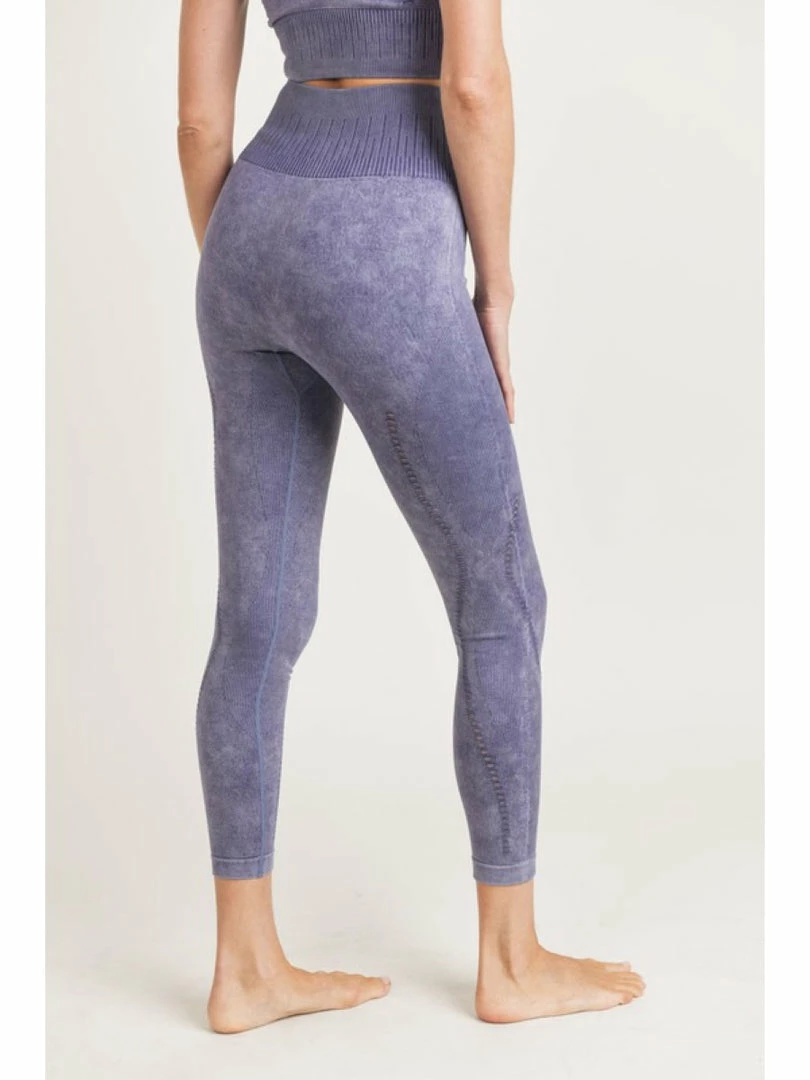 This pair of seamless leggings features a unique, splice accent on the outer side of the legs in a ribbed texture, as well as a two sets of perforations that go from the lower thigh and wrap around the shin and along the back. 93% nylon, 7% spandex. Seamless technology. Mineral-washed. Tummy control. Moisture-wicking. Four-way stretch. Made in China.