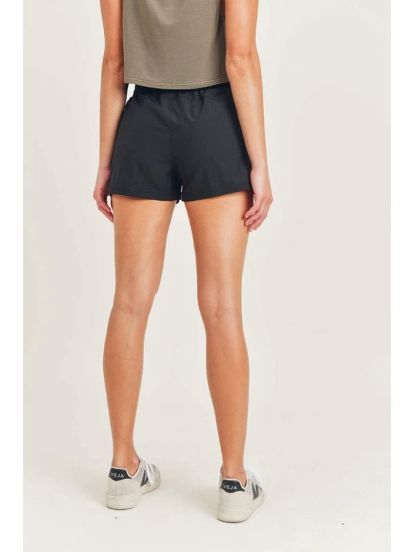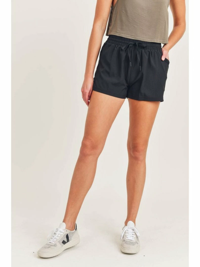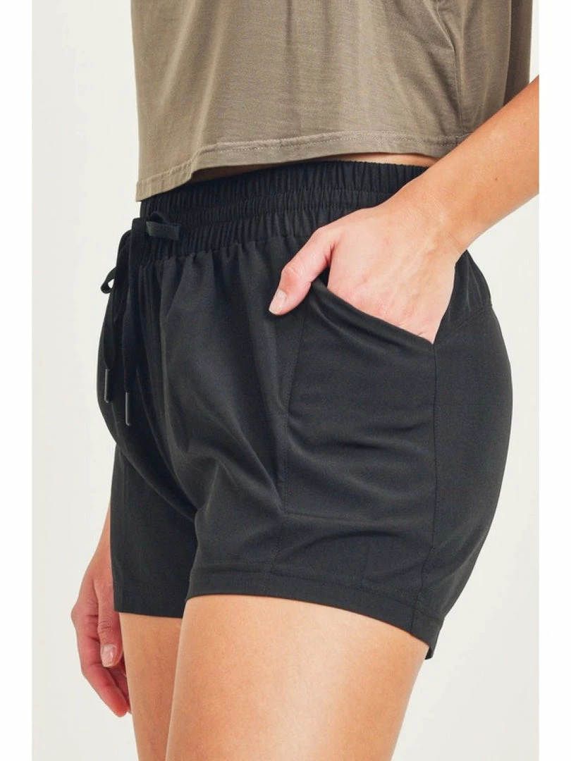 This pair of shorts features an elasticized waistband (with a drawstring closure) and a functional pocket on each side. Perfect for running or lounging. 92% polyester, 8% spandex. Moisture-wicking. Four-way stretch. Made in China.