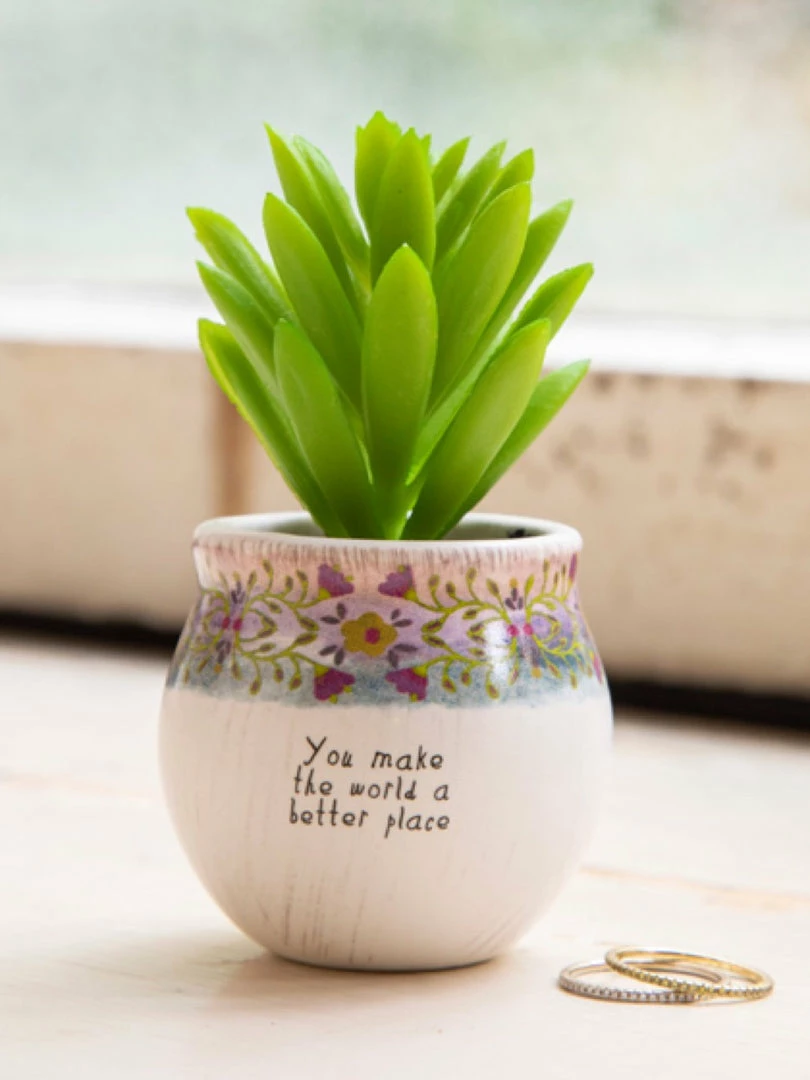 Add a little charm to any space with this lifelike succulent in a hand-molded tiny pot. This petite planter features a colorful floral design and heartfelt sentiment. Makes a lovely gift for friends and coworkers.