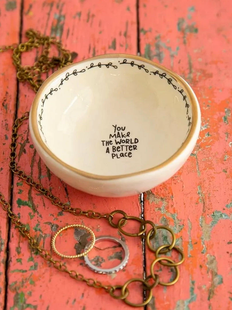 This round hand-molded trinket bowl features a gold-rimmed edge & sweet sentiments. They make a perfect gift for friends & family