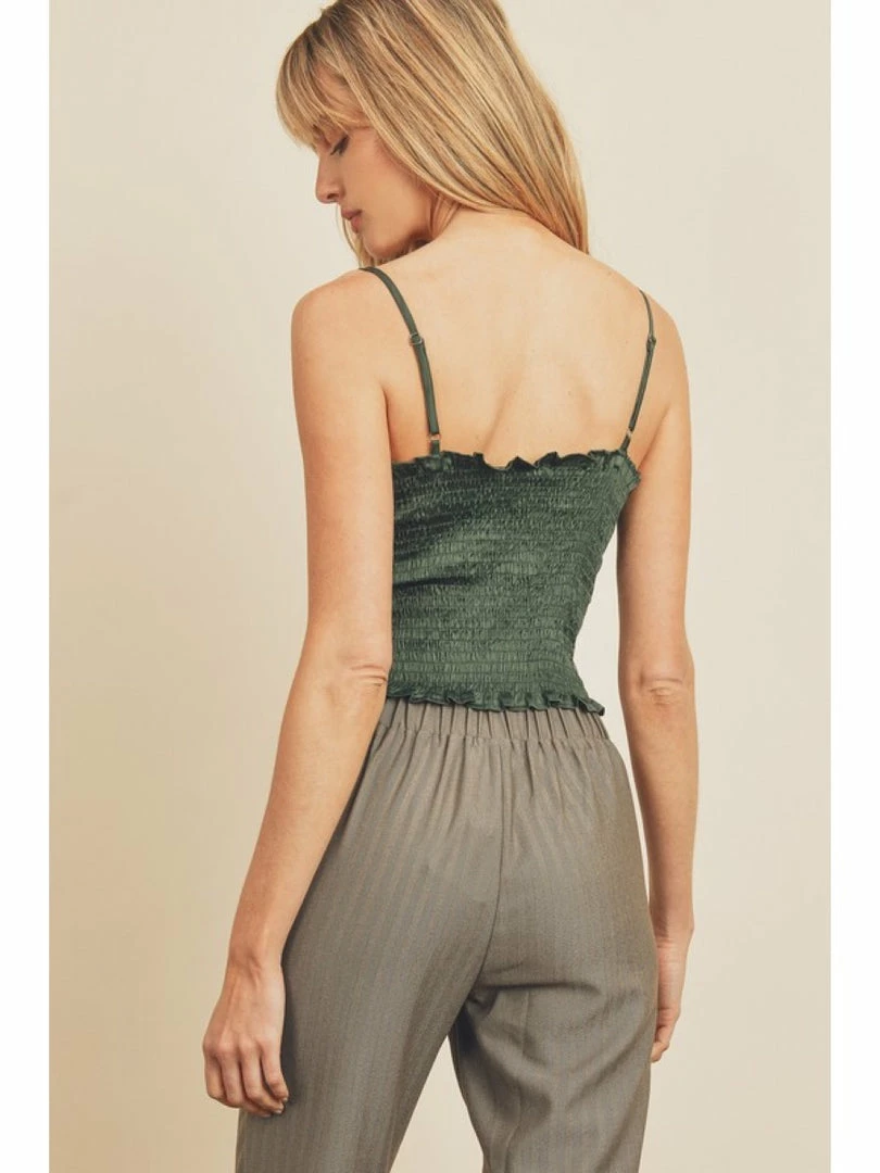 Satin cami top featuring a cowl neck and smocked back. Adjustable shoulder straps. Model is 5'9" and wearing size Small.