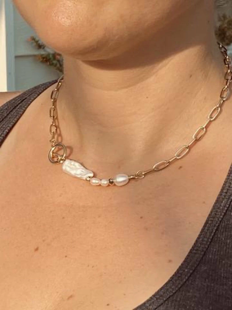 Wide cable chain necklace with freshwater pearl feature! 18k gold plated brass chain.