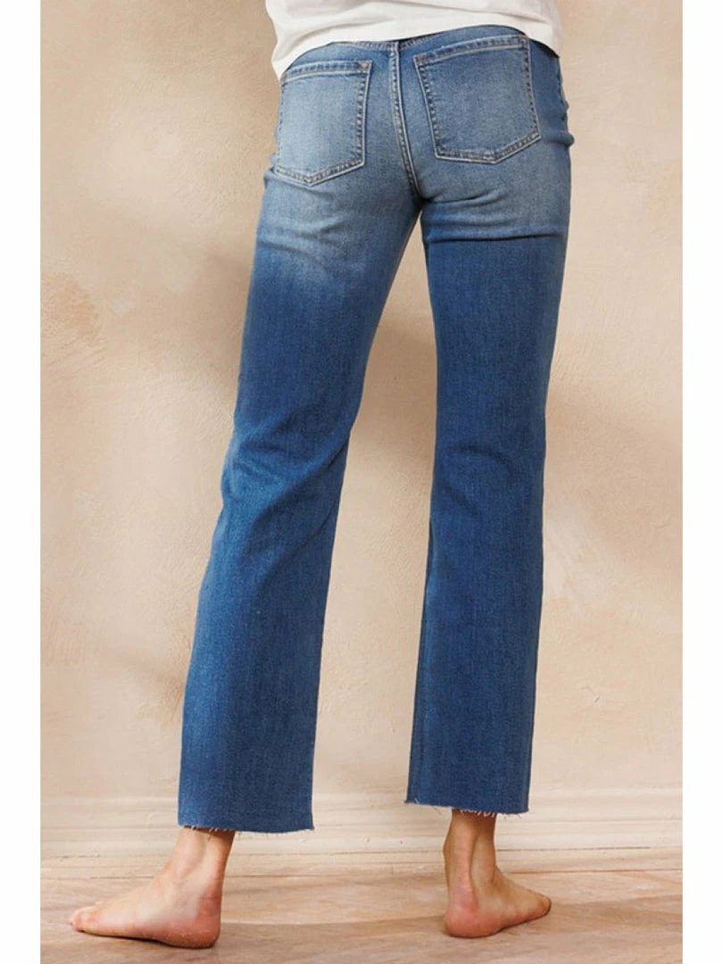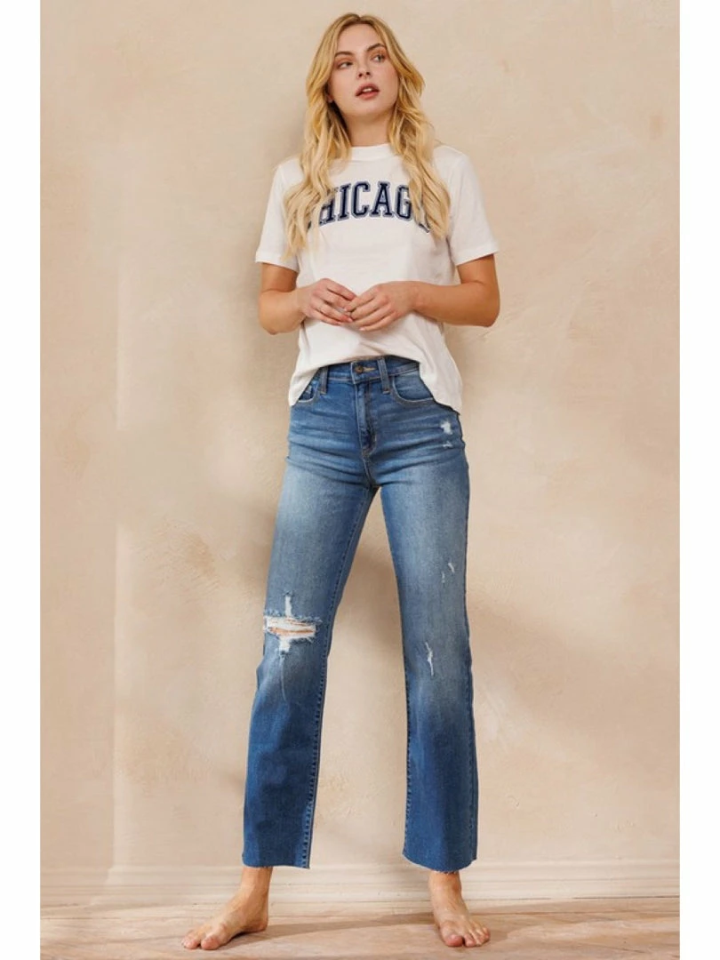 HIGH RISE STRAIGHT LEG JEANS WITH DISTRESS AND RAW CUT HEM Leg Opening: 16" Front Rise: 10 1/2" Inseam: 29" Knee: 17 1/2" Based on photo. Model is 5'11" and is wearing a size 26.