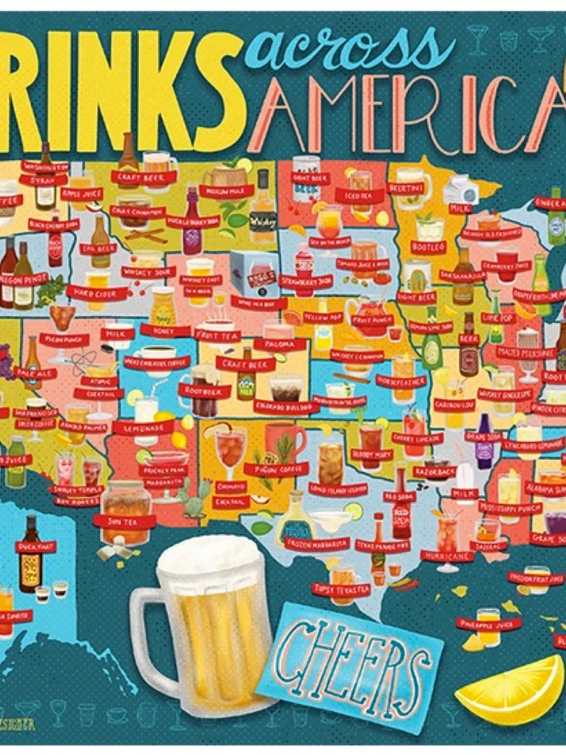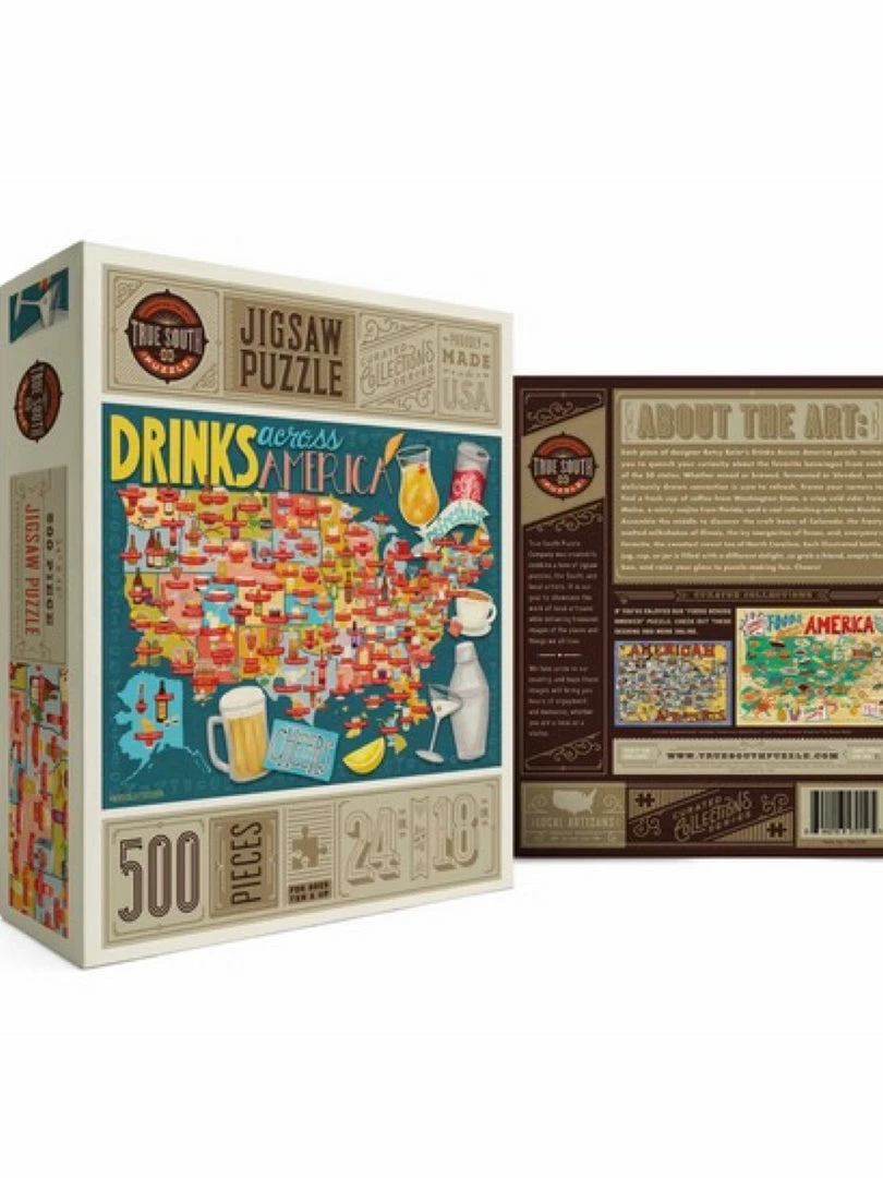 Each piece of designer Betsy Beier’s Drinks Across America puzzle invites you to quench your curiosity about the favorite beverages from each of the 50 states. Each illustrated bottle, jug, cup, or jar is filled with a different delight, so grab a friend, empty the box, and raise your glass to puzzle-making fun. Cheers!