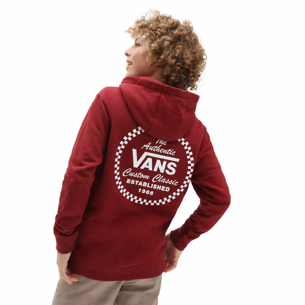 Wrap up and enjoy the warm comfort of a fleece pullover hoody with the Vans Custom Classic Boys Hoody in Pomegranate. The classic Vans checkerboard design is implemented in a stylish circular print on the back, complimented by a smaller version on the chest. The hoody features a front kangaroo pocket and looks great with shorts or trousers and is sure to be one of their daily go to tops.