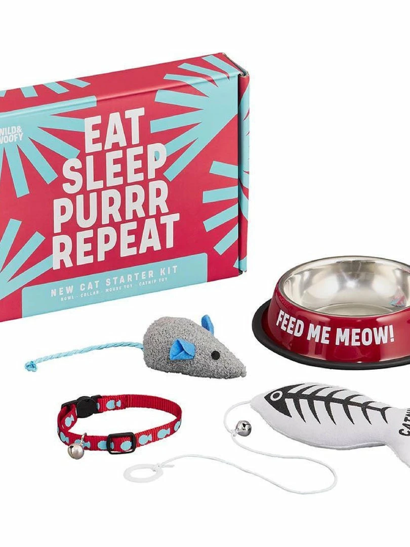 Eat, Sleep, Purrr, Repeat! Welcome your new feline friend to the family with this New Cat Starter Kit from Wild & Woofy!